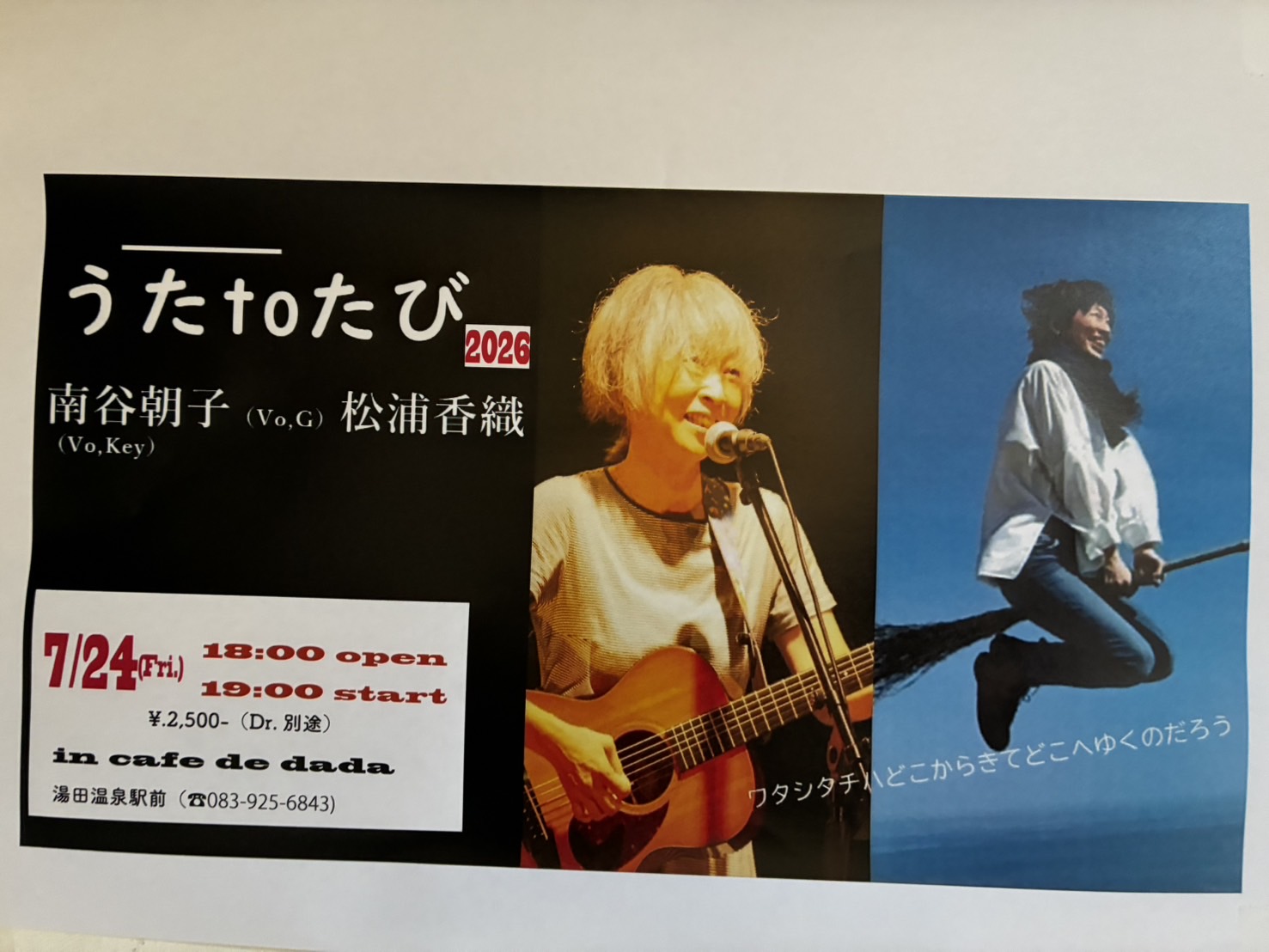 山口に暮らしてるときはべすぱにとってHOMEだったdada!久しぶりに歌いに帰ります。今回は南谷朝子さんと2人旅。朝子さんと日田で出会ってからもうすぐ2年だけど、20年くらい前にdadaの香原さんから朝子さんのことは聞いていました。長いスパンで見て当時から私の音楽活動を繋いでくれていたんだなとあらためて香原さんに感謝!山口のみなさん、湯田温泉駅前dadaへぜひお越しください。