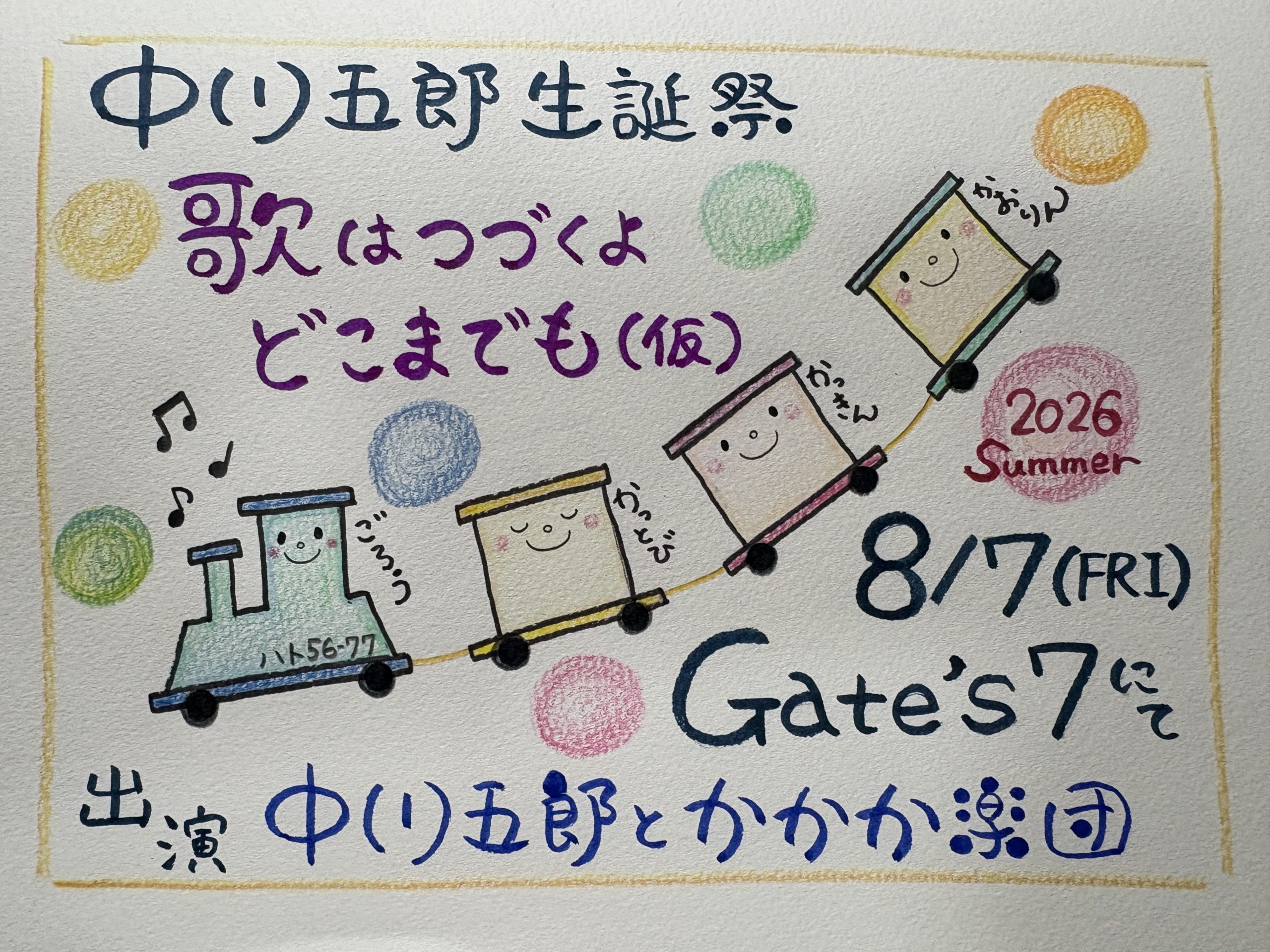 この夏、かかか楽団の名付け親中川五郎さんは77才に!みんなで集まってお祝い音楽会します。2023年秋から始まった五郎さんとかかかのライブ、やればやるほど新しい発見やお互いの感覚を分かり合えてく感じがしています。私たちのLOVE&PEACEな旅はまだまだ続く!博多ゲイツ7Live翌日の8/8(土)は小倉BIGBANDにてライブ予定。どちらのライブも詳細が決まり次第お知らせします。