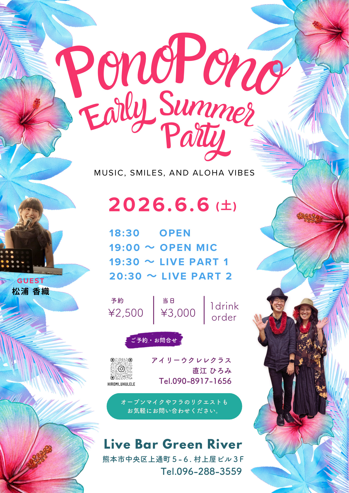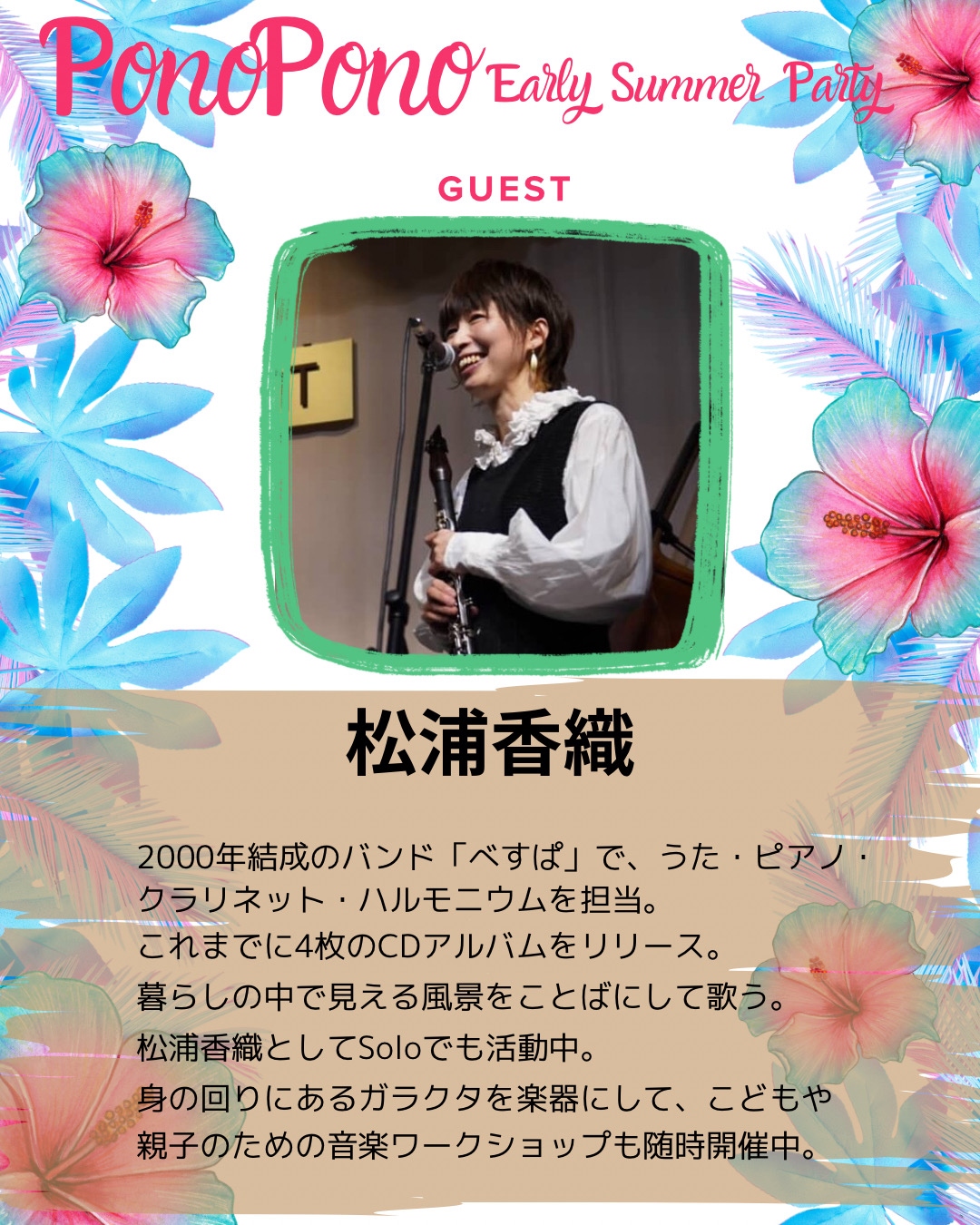 PonoPonoのひろみさんとは、ハワイアンバンドBABIESで出演したイベントで知り合いました。お家もご近所で意気投合してその後もお互いのLiveを見にいったり来てくれたり。今回PonoPonoさんのハワイアンパーティーLiveで一緒に音楽することになってとっても楽しみです。オープンマイクもあって賑やかな日になりそう。みなさん是非お越しください。