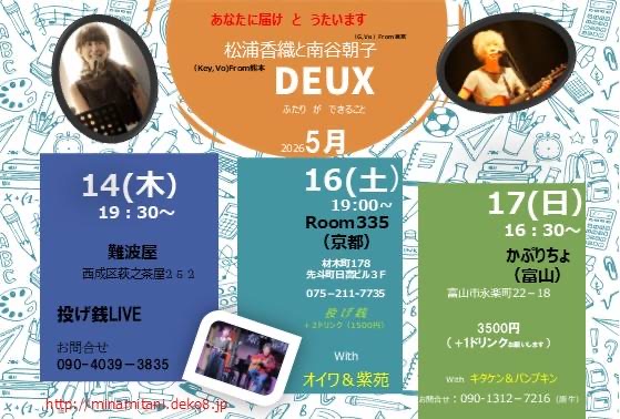 南谷朝子と松浦香織のツアーが決定!大阪→京都→富山と歌の旅に出ます。2024年に日田で朝子さんと出会い、2025年には2人で九州3ヶ所をツアー。今年はまた遠くの町へ2人で歌を届けに出かけます。DEUX〜ふたりができること〜ここからまだまだいろんなことが生まれそうな予感。