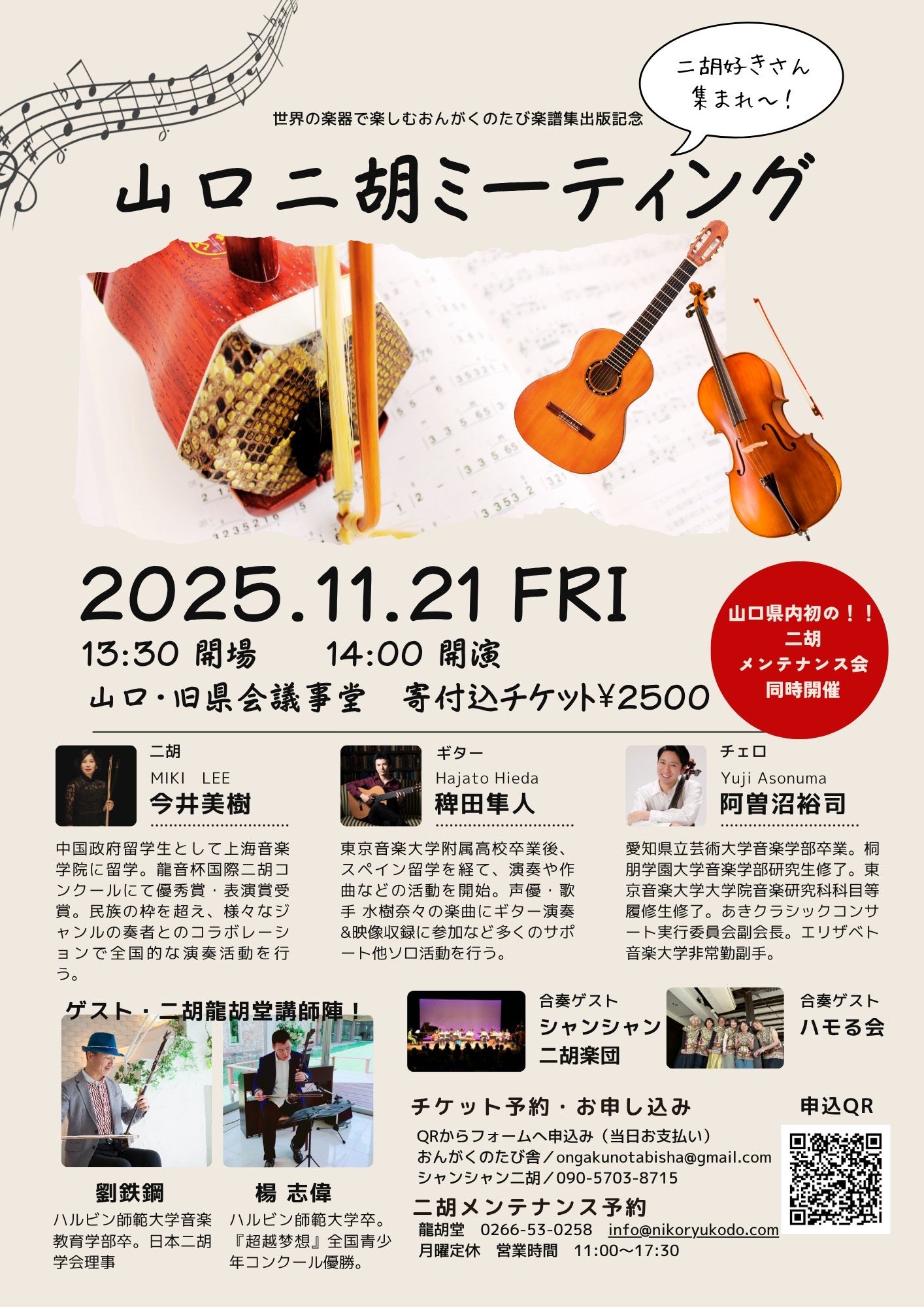 二胡奏者の今井美樹さんは以前山口の徳山に住んでいて、私も美樹さんも当時小さな我が子を連れて親子のためのライブなど山口のあちこちをライブして回っていた。11年前私は熊本へ、美樹さん家族もその後長野にお引っ越し、それ以来ずっと会えずにいたんだけど、先週山口に歌いにいったとき、「来週美樹さんが山口に演奏に来るよ」と竪小路の仲間から情報を得る。美樹さんがライブする日は私もちょうど山口の明星幼稚園でのライブを頼まれている日の前日でセッティングに入る予定でいたから、嬉しくなってすぐに美樹さんに電話。「香織ちゃんと同じ町にいて音楽で絡まないわけにはいかんよね私たち!」と急遽決まった共演。約12年ぶりに今井美樹さんと音楽します。きっと音を聞いていただけたら私たちがこれまで大事にしてきたことが皆さんにきっと伝わると思っています。私のとても大切な友だちとの急遽決まったライブ、是非是非お越しください。